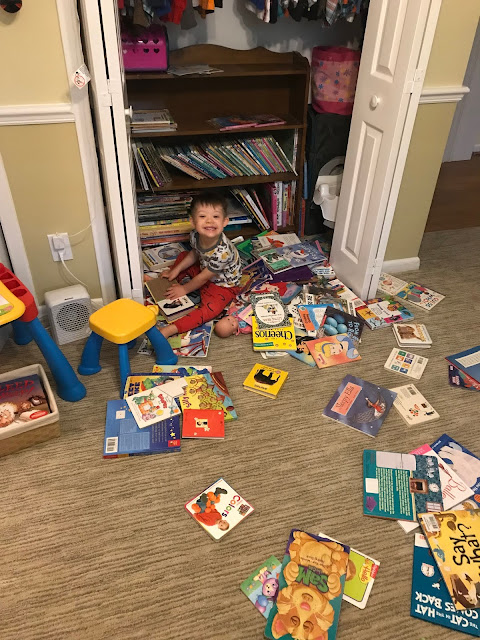 New favorite, he sits under the pile of books going through each one carefully